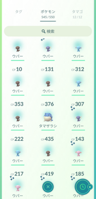 コミュデイは14時~17時の3時間。私は前半2時間くらい歩き回りましたが、結果はこの通り10匹の色違いウパーをゲットできました!(画面は9匹ですみません…)