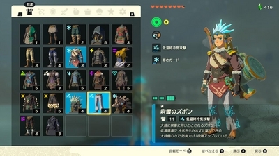 ところで今リンクが着用している吹雪の○○シリーズ。低温環境では冷気の攻撃が出せるという特殊な服なのですが、ズボンに模様が出ていることを今初めて知りました。