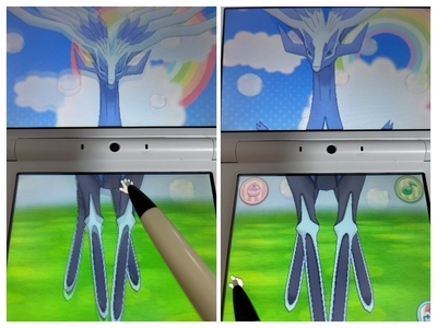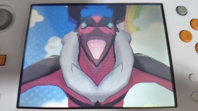両画面になるくらい大きなポケモンですが、上画面と下画面の間部分のボディが圧縮されている気が…。イベルタルってもっとこう…ガバっと大きなポケモンだった気が…。